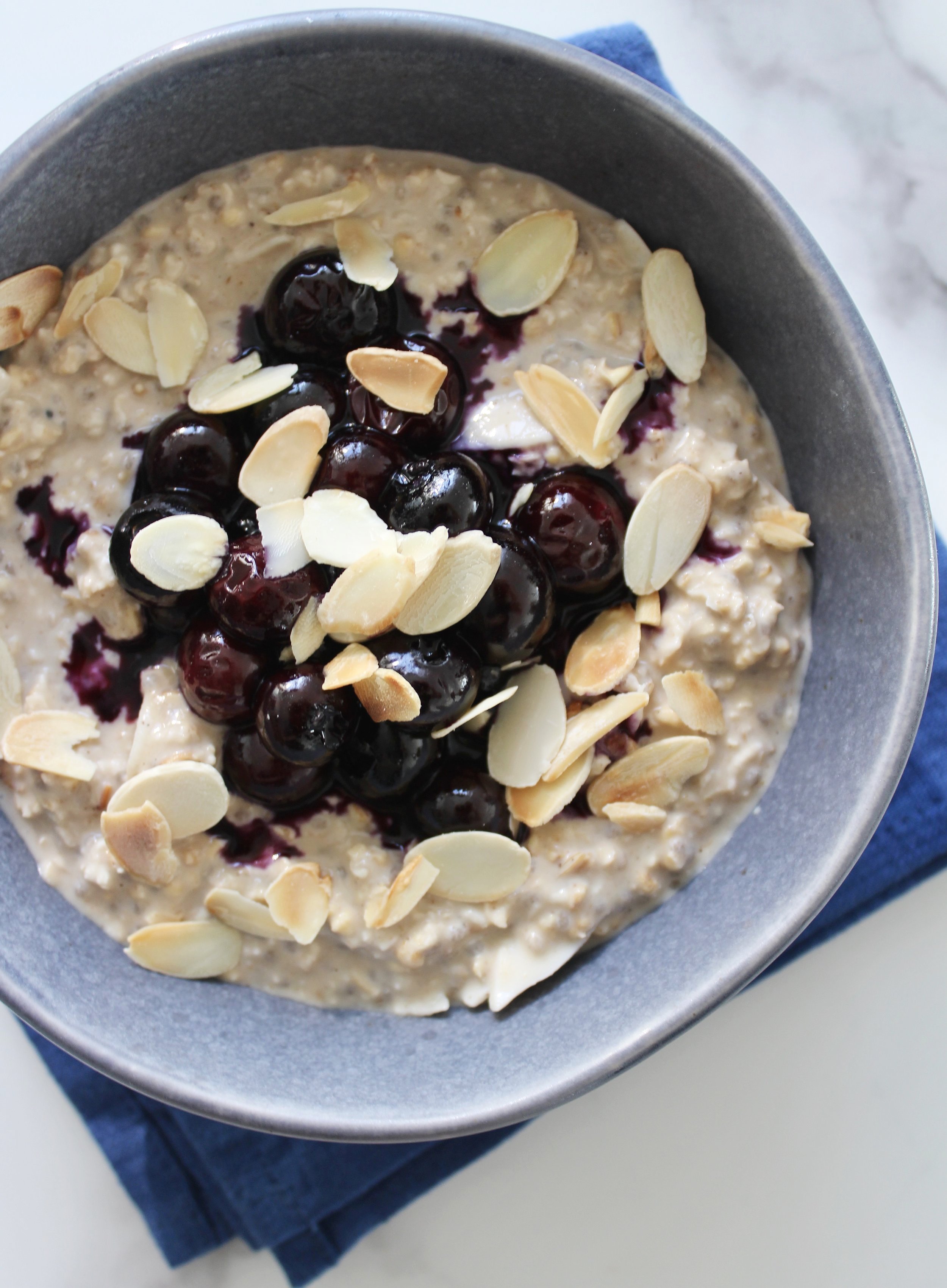 Combine everything in a medium sized bowl except the blueberries and flaked almonds. Leave in the fridge for a minimum of 8 hours/ideally overnight.