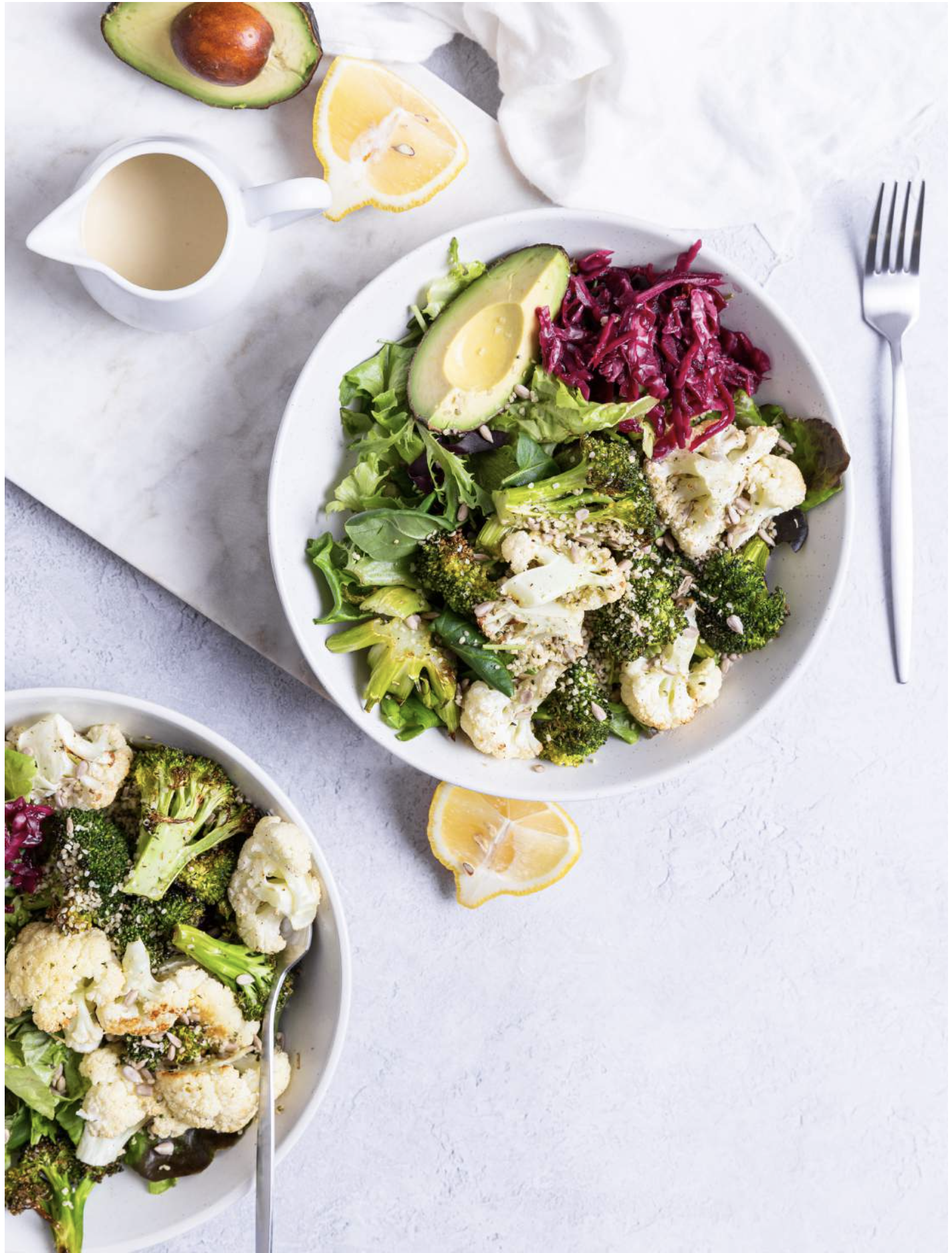 Preheat the oven to 350°F (180°C). Chop the cauliflower and broccoli florets into medium-sized pieces and place onto a baking sheet lined with parchment paper. Sprinkle the cauliflower and broccoli with salt and pepper and a drizzle of avocado oil. Bake for 15 minutes until the vegetables start to brown at the edges.