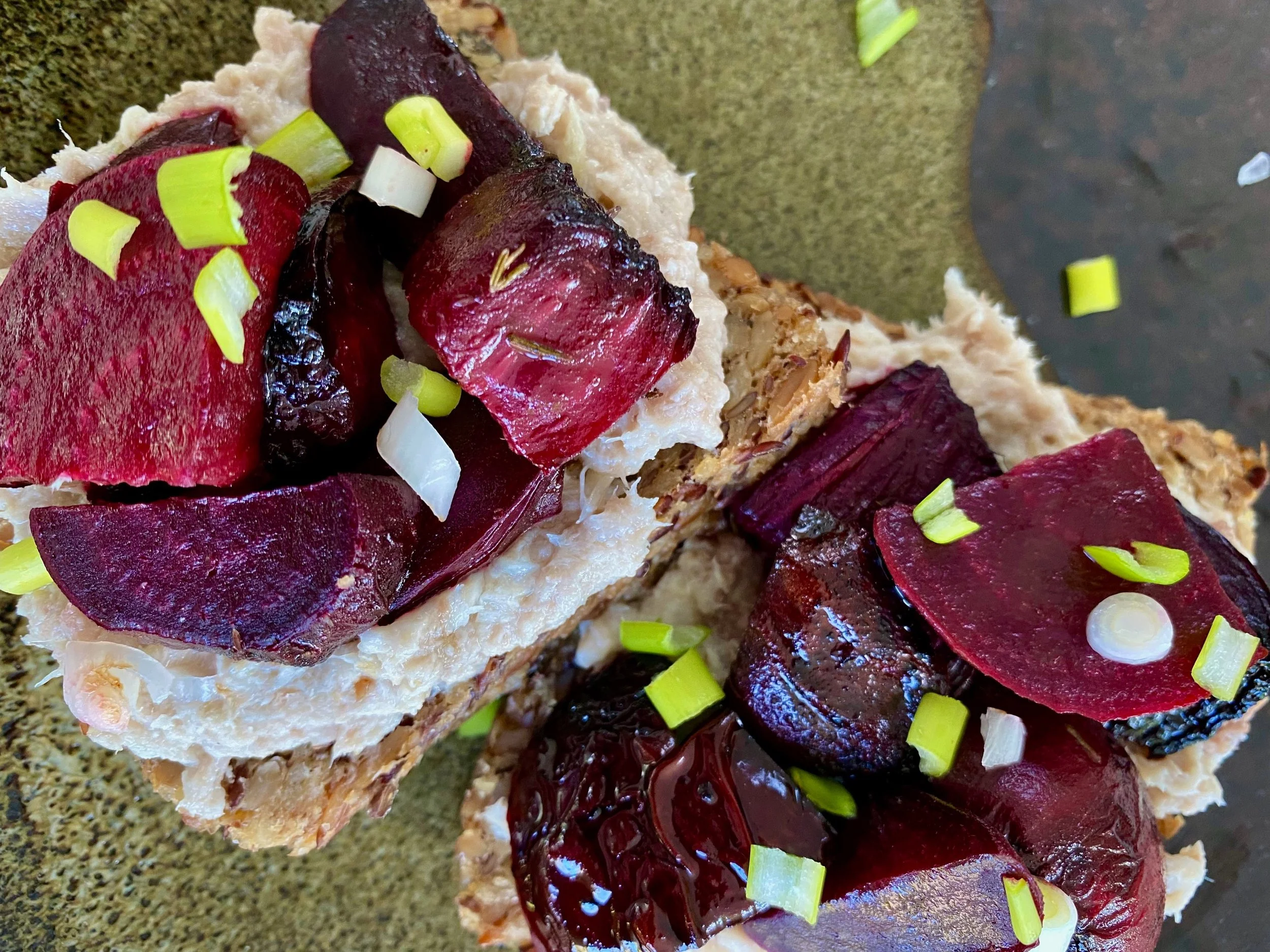 Spread this pate on the bread, top with beetroot and spring onion and serve